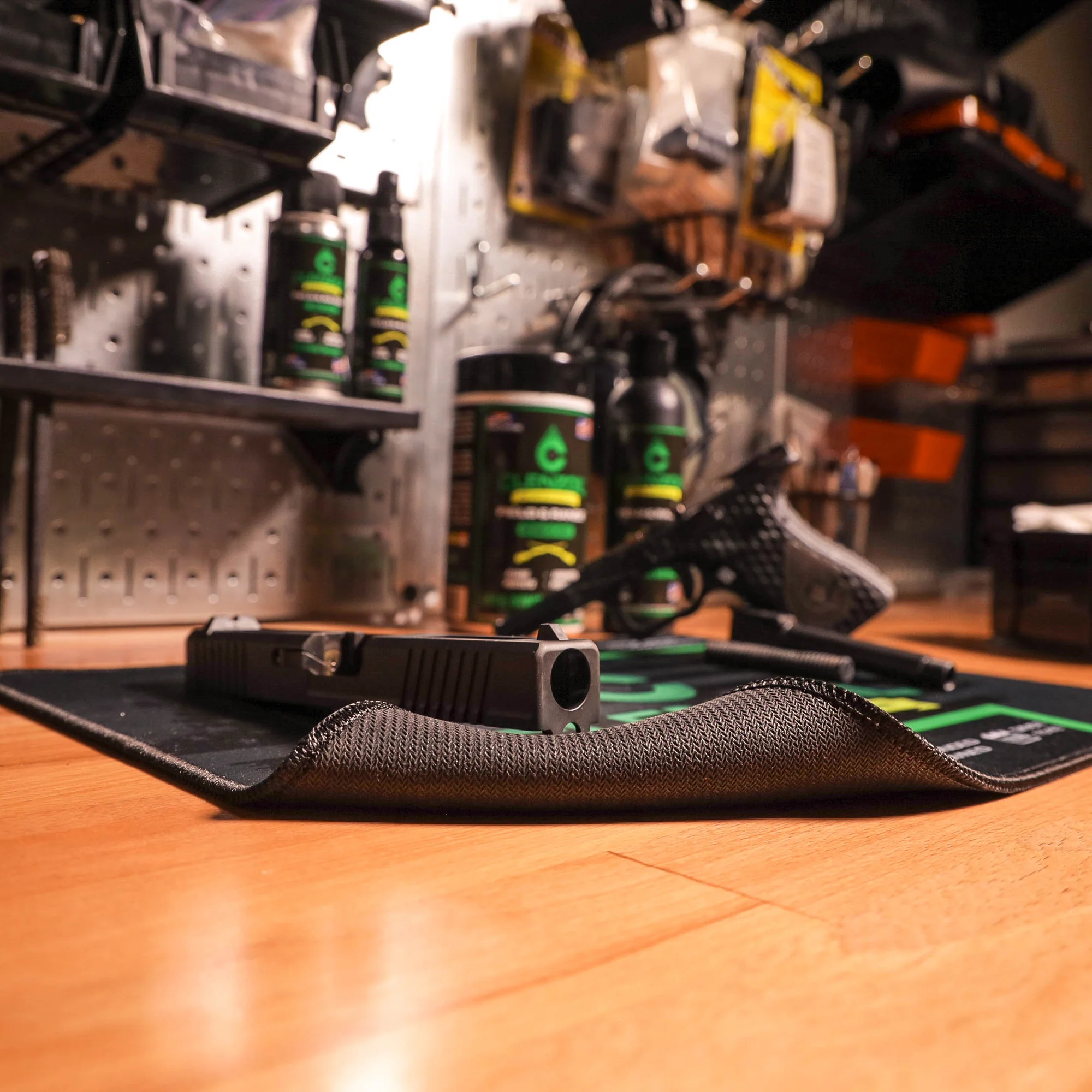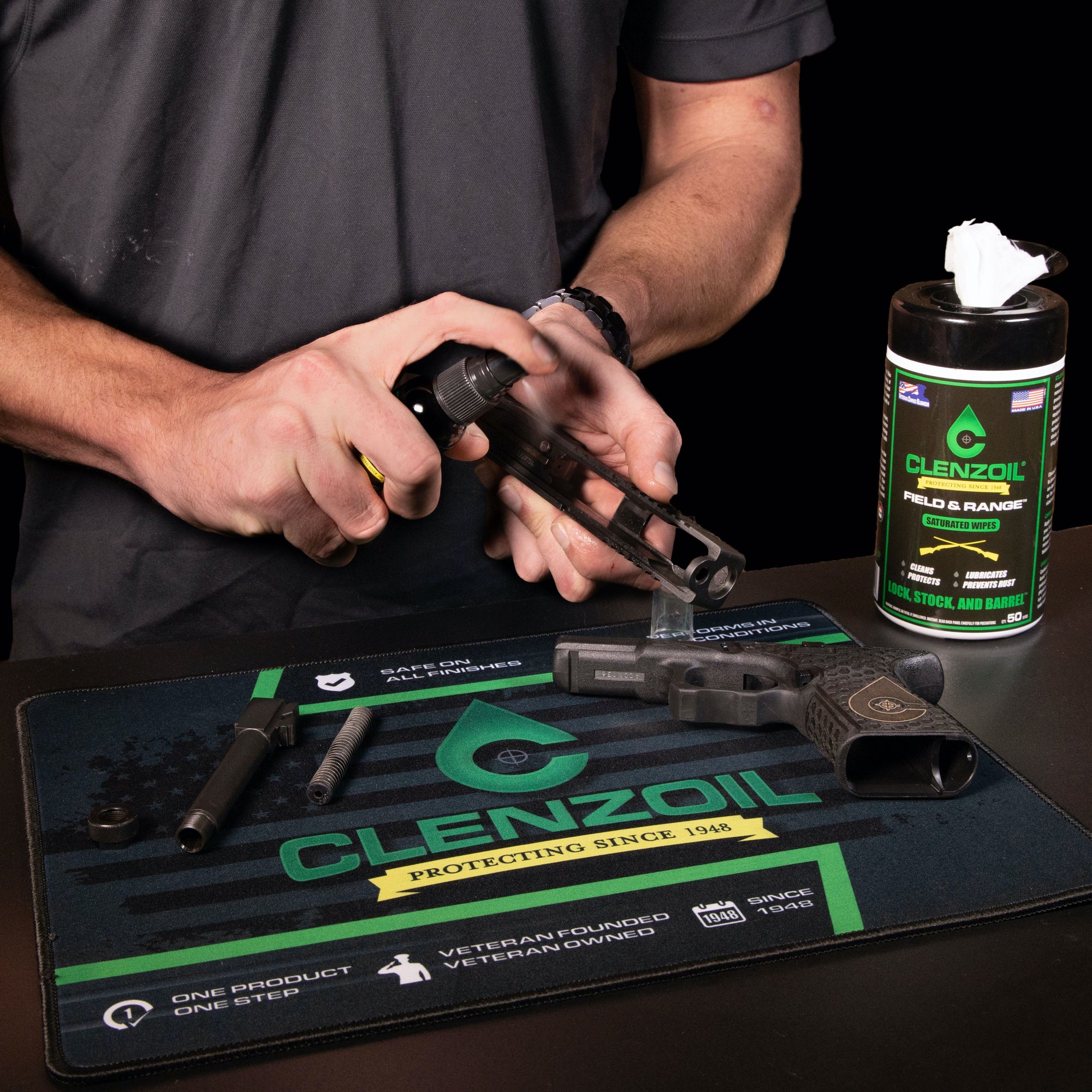 Clenzoil® Gun Cleaning Mats are made of 3MM thick water resistant polyester with a neoprene rubber backer and stitched edges. Keep your work surface free of unwanted dirt or oil. Machine wash on delicate cycle and let air dry to keep your mat clean.